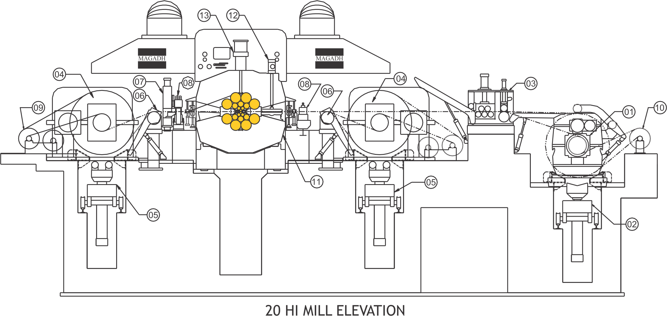 Magadh can supply 20-Hi mills for strip widths up to 1625 mm, minimum finished strip thicknesses up to 0.05 mm, and mill speeds up to 800 MPM. These mills are popular for rolling high tensile ferrous and non-ferrous metal strips, especially wider strips to thinner gauges, more effectively than other mill designs.